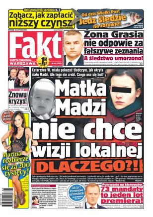 Żona rzecznika rządu, Pawła Grasia, nie odpowie za składanie fałszywych zeznań; Katarzyna W., matka Magdy z Sosnowca, nie chce wizji lokalnej; prymas Józef Glemp przebywa w szpitalu; Alan Andersz walczy o życie; Dominique'owi Strauss-Kahnowi zarzuca się stręczycielstwo.