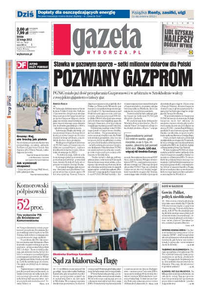 PGNiG ma dość przepłacania Gazpromowi i w arbitrażu w Sztokholmie walczy z rosyjskim gigantem o tańszy gaz; przyjęcie ACTA mogłoby godzić w prawa i wolności konstytucyjne – uznała rzeczniczka praw obywatelskich Irena Lipowicz w opinii przygotowanej na prośbę prezydenta; Dominique Strauss-Kahn podejrzewany jest i współudział w stręczycielstwie i malwersacjach finansowych; czy dozbrojenie Syryjskiej Wolnej Armii to dobra droga do pozbycia się krwawego reżimu.