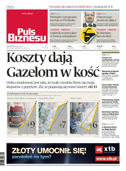 Łotwa, która w 2009 r. otarła się o bankructwo, ma najszybciej rosnącą gospodarkę w UE; Katarzyna Niezgoda przegrała z Pekao – bank miał prawo zwolnić dyscyplinarnie byłą wiceprezes; przemysł skórzany szuka tańszych, ale nie chińskich, producentów i dostawców – do łask wraca Europa; Polska Telefonia Cyfrowa dokona relaunchu młodzieżowej marki.