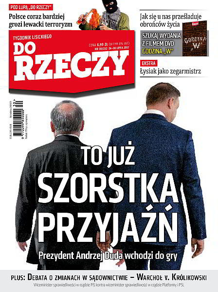 To już szorstka przyjaźń: prezydent Andrzej Duda wchodzi do gry; debata o zmianach: Marcin Warchoł, wiceminister sprawiedliwości w rządzie PiS kontra Michał Królikowski, wiceminister sprawiedliwości w rządzie Platformy i PSL; Polsce coraz bardziej grozi lewacki terroryzm; jak się u nas prześladuje obrońców życia; Łysiak jako zegarmistrz; Wimbledon zdobyty: Łukasz Kubot – pierwsza rakieta RP.