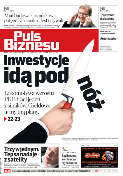 Realna gospodarka zaczyna odczuwać kryzys, kilka spółek giełdowych zweryfikowało w dół plany inwestycyjne na ten i na przyszły rok; TP SA trafia z potrójną ofertą pod strzechy 9 mln domostw; jest projekt rządowego wsparcia dla instytucji finansowych; zagraniczne plany KGHM przybierają konkretny kształt.