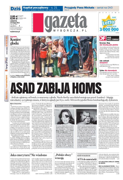 W syryjskim mieście Homs, od trzech tygodni bombardowanym przez siły rządowe, zginęło już 3 tys. osób, w tym dwoje dziennikarzy: Marie Colvin i Remi Ochlik; akcja „Misja Warszawy” obejmie uniwersytety, akademiki, a nawet puby – księża mają rozmawiać z ludźmi, urządzać dyskusje, happeningi; Komisja Europejska posyła ACTA do unijnego Trybunału w Luksemburgu.