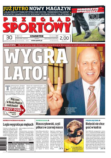 Grzegorz Lato jest pewniakiem w dzisiejszych wyborach na szefa PZPN; Wisła Kraków w ćwierćfinale Pucharu Polski; mecz Legia - Jagiellonia rozstrzygnęły dopiero rzuty karne; mimo maski na twarzy Błaszczykowski zaliczył dobry występ w Bundeslidze; wywiad z Jerzym Dudkiem; Jerzy E. junior zamieszany w aferę korupcyjną Korony Kielce; bardzo lubię grać w naszej ekstraklasie - mówi Janusz Grancarczyk; rozpoczął się 63. sezon NBA; Karol Bielecki nie będzie grał w reprezentacji piłki ręcznej; ostatnie próby Małysza na igielicie; Diego Maradona trenerem Argentyny.