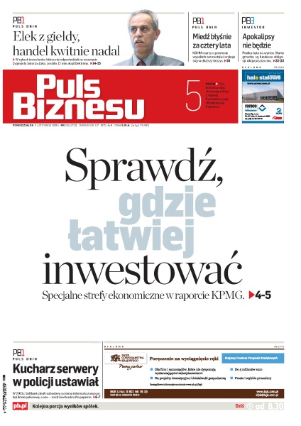 Ranking polskich stref ekonomicznych - Wałbrzych prowadzi, Słupsk najgorzej; śledztwo PB: giełdowa spółka poprzez podwykonawców zleciła kucharzowi realizację policyjnych systemów informatycznych, jubilerów czeka kwartał ponadprzeciętnych zarobków, KGHM przygotowuje strategię na długi kryzys, obecny krach obnażył podział światowych gospodarek na równe i równiejsze, zupełnie niezłe prognozy analityków na koniec roku na GPW.