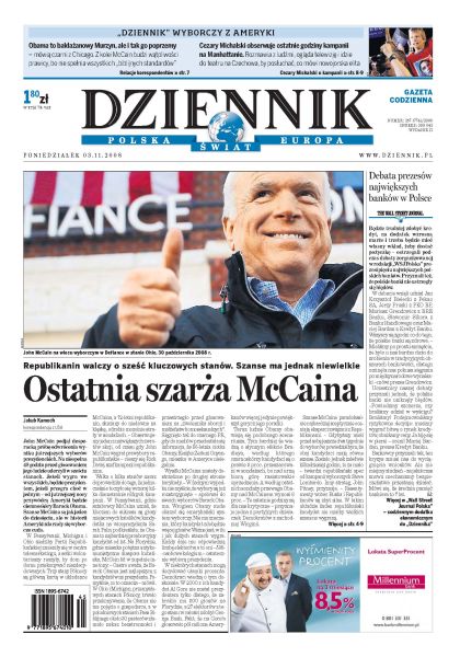 Ostatnie godziny kampanii prezydenckiej w USA, McCain walczy o sześć kluczowych stanów, ma jednak małe szanse na wygraną; rząd chce, by Lech Kaczyński przedstawił w Brukseli plan dojścia do unijnej waluty; w biznesie i w polityce Grzegorz Lato się nie sprawdził, jak będzie teraz; Aleksander Kwaśniewski zaprzecza, że spędzał wakacje w towarzystwie agenta Ałganowa; profesor Zoll tłumaczy, dlaczego in vitro ma być dostępne tylko dla małżeństw; partie traktują posłów jak własność; rząd rozpoczął prace nad specjalną ustawą antyterrorystyczną; rozmowa z Przemysławem Gosiewskim. Dodatki: The Wall Street Journal, Warszawa, Praca.