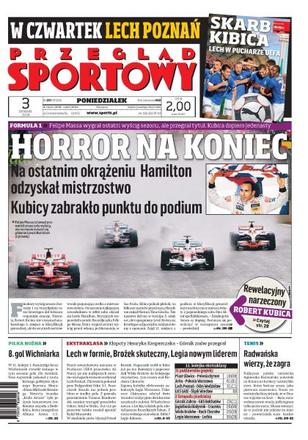 Massa wygrał ostatni wyścig sezonu ale tytuł odzyskał Hamilton, Rober Kubica nie utrzymał miejsca na podium; Mirosław Drzewiecki nie zamierza rozmawiać z premierem o zjeździe PZPN, tymczasem w zarządzie związku praktycznie nic się nie zmieni; Legia pokonała Lechię 3:0 wysuwając się na pozycję nowego lidera; mimo słabszego składu Wisła bez trudu pokonała Ruch; wywiad z Pawłem Brożkiem; Semir Stilić - młoda gwiazda Lecha; nie mieliśmy do zespołu pretensji o porażkę z Polonią - mówi prezes Arki Gdynia; Agnieszka Radwańska liczy na grę w Katarze; Rumunia pokonała zawodników Bogdana Wenty.
