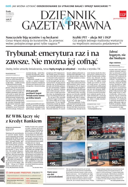 ZUS nie może dowolnie odebrać raz przyznanej emerytury lub renty – tak orzekł Trybunał Konstytucyjny; BZ WBK łączy się z Kredyt Bankiem; Białoruś mści się na wszystkich, którzy popierali sankcje wobec dyktatora i jego popleczników; złoty jest najsilniejszy od połowy 2011 roku; Francja ma dwa lata na uniknięcie katastrofy i problemów podobnych do włoskich.