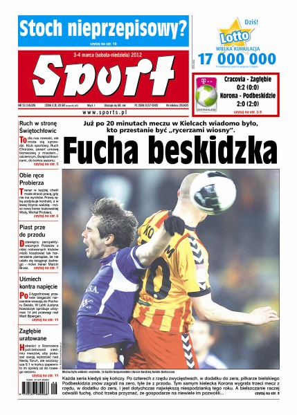 Międzynarodowa Federacja Narciarska wymusiła na Kamilu Stochu ukrycie nazwy sponsora na kasku; Cracovia wygrała z Zagłębiem Lubin i uciekła z dna tabeli; Korona Kielce pokonała Podbeskidzie Bielsko-Biała, sędzia dziewięć razy pokazywał żółtą kartkę; Śląsk Wrocław zagra z Widzewem Łódź; Michał Probierz nie miał jeszcze czasu na zajęcie się sprawą Patryka Małeckiego; Świętochłowice zostały partnerem biznesowym Ruchu Chorzów; mecz Polski z Portugalii obserwował wysłannik reprezentacji Czech; Justyna Kowalczyk chodzi uśmiechnięta przed zawodami w Lahti; Asseco Resovia gładko wygrało z Jastrzębskim Węglem; Mariusz Fyrstenberg i Marcin Matkowski wystąpią w finale turnieju debla w Dubaju.