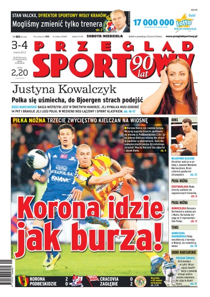 Korona Kielce wygrała trzeci mecz w rundzie wiosennej; Zagłębie Lubin opuściło strefę spadkową po zwycięstwie nad Cracovią; analiza przed kolejnymi spotkaniami kolejki; w piłkarskiej ekstraklasie został tylko jeden trener z zagranicy; jak Śląsk Wrocław szukał lewego obrońcy; Maciej Skorża: Legii zostało 11 meczów o życie; w meczu Borussii Dortmund z Mainz zobaczymy czterech reprezentantów Polski; w Premier League Koguty chcą dogonić mistrzów i uciec Kanonierom; Justyna Kowalczyk będzie walczyła w Lahti o utrzymanie przewagi nad Marit Bjoergen; Agnieszka Radwańska wycofała się z turnieju w Kuala Lumpur; Władymir Kliczko ma szansę po raz 50. wygrać przez nokaut – tym razem z Jeanem-Markiem Mormeckiem; ból pleców dramatem Andrija Szewczenki przed Euro.