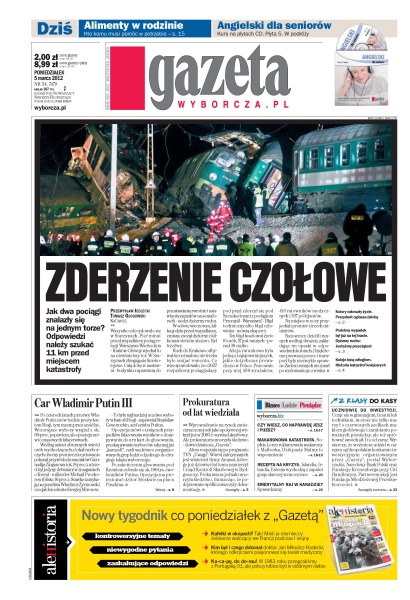Zderzenie czołowe – jak dwa pociągi znalazły się na jednym torze – odpowiedzi należy szukać 11 km przed miejscem katastrofy; alimenty w rodzinie – kto komu musi pomóc w potrzebie; car Władimir Putin III – po czterech latach przerwy Władimir Putin znów będzie prezydentem Rosji, tym razem przez sześć lat; prokuratura od lat wiedziała o wprowadzaniu na rynek zanieczyszczonej soli jako spożywczej, ale umorzyła śledztwo; czy wiesz co naprawdę jesz i pijesz; makaronowa katastrofa – Sophia Loren reklamowała makarony z Malborka – dziś pasty Malmy to wspomnienie; Islandia, Irlandia, Estonia wychodzą z zapaści gospodarczej wzmocnione.
