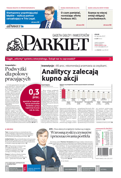 Największy w Polsce newsroom gospodarczy zbiera, analizuje i zgłębia dla Państwa najważniejsze informacje ze świata finansów. Codzienne wydanie „Parkietu”, sześć dni w tygodniu, to kilkadziesiąt artykułów o emitentach, instytucjach finansowych, gospodarce. To również opinie, felietony i wywiady z najważniejszymi ludźmi krajowej i globalnej finansjery.