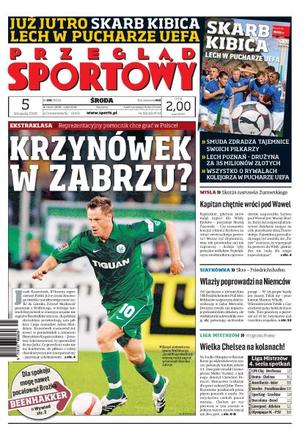 Jacek Krzynówek może trafić do Górnika Zabrze; Skorża namawia Żurawskiego do powrotu do Wisły; Chelsea pokonana przez Romę; następnym razem pocałuję Brożka - wywiad z Leo Beenhakkerem; Ivan Turina stanie w bramce Lecha w czwartkowym meczu z Francuzami; od spotkania z niemieckim VfB Friedrichshafen PGE Skra Bełchatów rozpoczyna dziś rywalizację w siatkarskiej Lidze Mistrzów; wywiad z Martą Domachowską; Andrzej Gołota jest w formie.