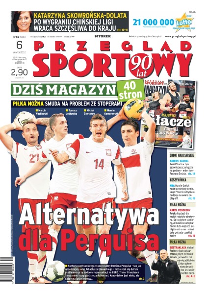 Alternatywa dla Perquisa – Franciszek Smuda ma problem ze stoperami; Katarzyńska Skowrońska-Dolata po wygraniu chińskiej ligi wraca szczęśliwa do kraju; Kamil Stoch w tym sezonie jeszcze będzie na podium – twierdzi lider Pucharu Świata Anders Bardal; Marcin Gortat nadal w wielkiej formie – jego Phoenix odzyskało nadzieję na awans do play-off; Karel Poborsky twierdzi, że polska liga jest dla Czechów atrakcyjna z powodu pięknych stadionów, atmosfery na trybunach i dużo większych pieniędzy; Michał Probierz jest najskuteczniejszym trenerem sezonu.