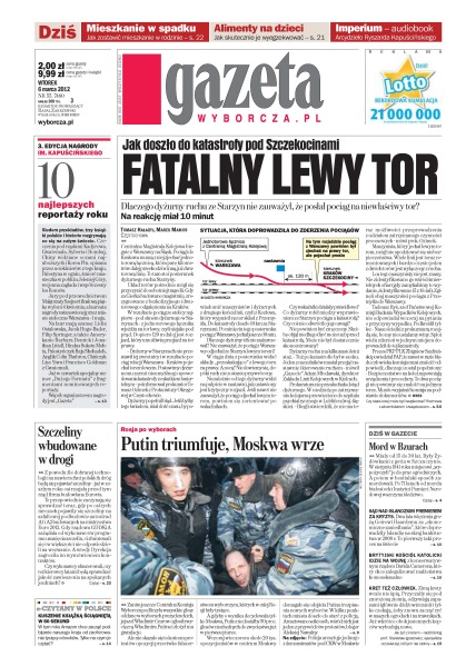 Fatalny lewy tor – jak doszło do katastrofy pod Szczekocinami; mieszkanie w spadku – jak zostawić mieszkanie w rodzinie; alimenty na dzieci – jak skutecznie wyegzekwować; szczeliny wbudowane w drogi – z powodu źle dobranej technologii na nawierzchni polskich dróg będą się pojawiać szczeliny; Rosja po wyborach – Putin triumfuje, Moskwa wrze; kuszenie książką ściągniętą w 60 sekund – w tym roku Amazon chce zacząć podbijanie naszego kraju od zaoferowania tysięcy e-booków; sąd nad islandzkim premierem za kryzys; brytyjski Kościół Katolicki idzie na wojnę z konserwatywnym rządem Davida Camerona, który chce zalegalizować małżeństwa homoseksualne.