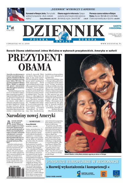 Barack Obama zdeklasował McCaina w wyborach, Ameryka w euforii; rodzina Obamów - po raz pierwszy w historii pierwsza para USA jest czarna; międzynarodowi eksperci uważają, że Obama wycofa się z budowy instalacji antyrakietowej; petardy poleciały na rząd i Sejm, związkowcy protestowali przeciwko ustawie o emeryturach pomostowych; generał Roman Polko odchodzi z armii; 12 bezzałogowych samolotów ochroni Polaków w Afganistanie; jak stworzyć dobre prawo o in vitro - rozmowa z posłami PO, PiS i SdPl; żbiki w Polsce najprawdopodobniej wyginęły; UEFA ma nas dosyć - rozmowa ze Zbigniewem Bońkiem. Dodatki: The Wall Street Journal, Warszawa.