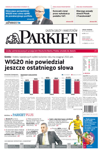 Największy w Polsce newsroom gospodarczy zbiera, analizuje i zgłębia dla Państwa najważniejsze informacje ze świata finansów. Codzienne wydanie „Parkietu”, sześć dni w tygodniu, to kilkadziesiąt artykułów o emitentach, instytucjach finansowych, gospodarce. To również opinie, felietony i wywiady z najważniejszymi ludźmi krajowej i globalnej finansjery.
