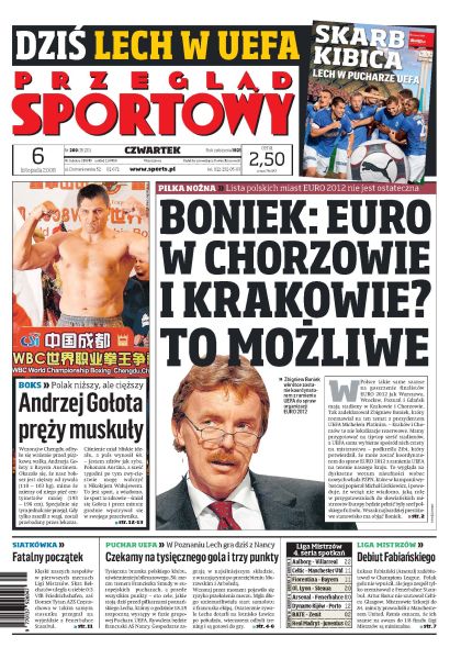 Lista polskich miast EURO 2012 nie jest ostateczna - wywiad ze Zbigniewem Bońkiem; dziś Lech Poznań zmierzy się z AS Nancy, to pięćdziesiąty mecz Franciszka Smudy w europejskich pucharach; Boruc pokonany w starciu z piłkarzami Manchesteru, nie zagra w meczu reprezentacji z Irlandią, bo czeka go zabieg na stawie kolanowym; Platini nie ufa nowym władzom PZPN; nasz zespół ciągle ma złą prasę - mówi Jacek Zieliński, trener Polonii Warszawa; Niemcy pokonali Skrę Bełchatów w 1. kolejce grupy F; Gołota jest zdrowy i gotów do walki z Austinem. Dodatek: Skarb Kibica.