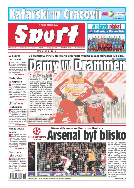 Damy w Drammen – 78 punktów straty do Marit Bjoergen można zacząć odrabiać już dziś; Kafarski w Cracovii; Arsenal był blisko – niezwykły mecz na Emirates Stadium; w Śląsku bez paniki – tylko dwa punkty w trzech pierwszych meczach T-Mobile Ekstraklasy wywołały spekulacje odnośnie sytuacji w Śląsku Wrocław; następstwa superpudła – Daniel Sikorski ma już nie zagrać nawet minuty w Polonii Warszawa; Pod znakiem zapytania