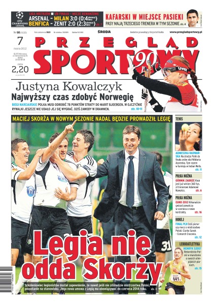 Legia Warszawa nie odda Skorży – Maciej Skorża w nowym sezonie nadal będzie prowadził Legię; Kafarski w miejsce Pasieki – Pasy mają trzeciego trenera w tym sezonie; Arsenal pokonał Milan 3-0; Agnieszka Radwańska ponownie zmierzy się z Wiktorią Azarenko, tym razem w turnieju w Indian Wells; Górnik Zabrze jest już winien trenerowi, Adamowie Nawałce, 360 tysięcy złotych; dziś pierwszy mecz o mistrzostwo Polski – Ciarko Sanok kontra Comarch Cracovia; Henryk Szost o swoich olimpijskich planach; Benfica pokonała Zenit 2-0.