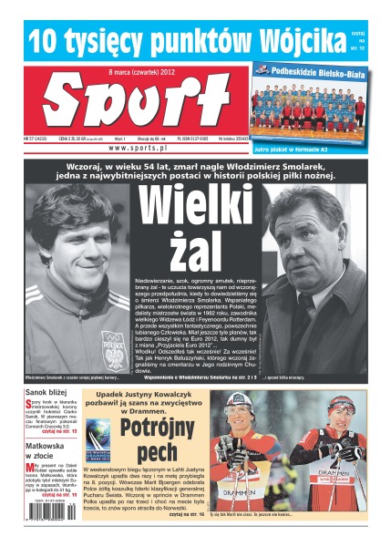 Wielki żal – wczoraj, w wieku 54 lat, zmarł nagle Włodzimierz Smolarek, jedna z najwybitniejszych postaci w historii polskiej piłki nożnej; potrójny pech – upadek Justyny Kowalczyk pozbawił ją szans na zwycięstwo w Drammen; 10 tysięcy punktów Wójcika; Sanok bliżej – spory krok w kierunku mistrzowskiej korony uczynili hokeiści Ciarko Sanok – w pierwszym meczu finałowym pokonali Comarch Cracovię 3-2; Iwona Matkowska sprawiła sobie miły prezent na Dzień Kobiet – zdobyła tytuł mistrzyni Europy w zapasach, triumfując w kategorii do 51 kg.