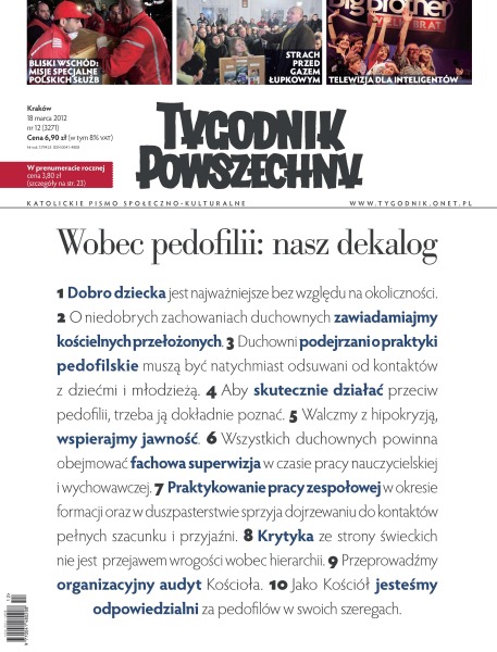 Już wkrótce również polski Kościół będzie w walce z pedofilią rozliczany z tego, co rzeczywiście robi;10 tez o pedofilii w Kościele Katolickim w Polsce; dopiero trzeci konwój wywiózł ciało słynnej reporterki Marie Colvin z oblężonego miasta Homs do ambasady polskiej w Damaszku; lekarstwem na letniość demokracji może być spór; czy w czasach kryzysu ekonomicznego i uwiądu wartości katolicy mają coś do zaproponowania społeczeństwu obywatelskiemu; uwagi Wojciecha Cejrowskiego o buddyzmie mają taką samą wartość, co stwierdzenie, że chrześcijaństwo opiera się na kanibalizmie; François Hollande wkracza do historii; Polacy, którzy 70 lat temu ratowali Żydów i zapłacili za to życiem, w ogromnej większości nie mają do dziś nawet skromnych pomników, które mówiłyby o ich bohaterstwie.