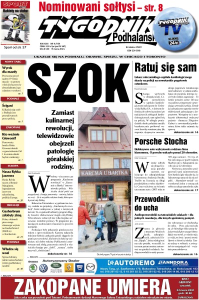 Zamiast kulinarnej rewolucji, telewidzowie obejrzeli patologię góralskiej rodziny; lekarz rabczańskiego szpitala kardiologicznego skarży na policji na nowotarskie pogotowie ratunkowe; ekskluzywne auto Andrzeja Stocha wylicytowała rodzinna firma biznesmena – porsche walczyło ponad 20 oferentów; audioprzewodniki na tatrzańskich szlakach - dla jednych rewolucja, dla innych spóźniony pomysł; sprawdziliśmy, jakimi samochodami jeżdżą podhalańscy notable.
