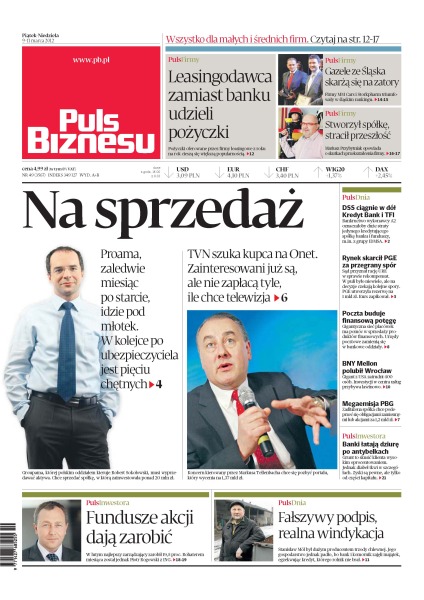 Na sprzedaż – Proama zaledwie miesiąc po starcie, idzie pod młotek – w kolejce po ubezpieczyciela jest pięciu chętnych; TVN szuka kupca na Onet – zainteresowani już są, ale nie zapłacą tyle, ile chce telewizja; leasingodawca zamiast banku udzieli pożyczki; Gazele ze śląska skarżą się na zatory; stworzył spółkę, stracił przeszłość – Mariusz Przybytniak opowiada o skutkach przekształcenia firmy; DSS ciągnie w dół Kredyt Bank i TFI; rynek skarcił PGE za przegrany spór; poczta buduje finansową potęgę; BNY Mellon polubił Wrocław – gigant z USA zatrudni 400 osób; megaemisja PBG – zadłużona spółka chce podeprzeć się obligacjami zamiennymi lub akcjami za 1,2 mld zł; fundusze akcji dają zarobić.