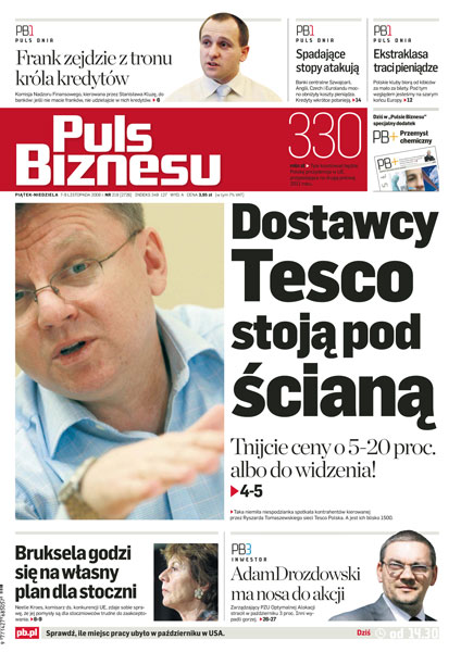 Tesco Polska próbuje wymusić na dostawcach znaczne obniżki cen produktów; KNF może zakazać udzielania kredytów hipotecznych we frankach szwajcarskich; nie ma niespodzianki, Komisja Europejska uznała udzieloną stoczniom pomoc publiczną za nielegalną, ale zaakceptowała plan ich sprzedaży do czerwca 2009; Polacy wciąż wycofują pieniądze z funduszy inwestycyjnych - czy słusznie?