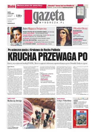 Krucha przewaga Platformy Obywatelskiej po ucieczce posła z Krakowa do Ruchu Palikota – kurczy się większość koalicji PO-PSL, może to zagrozić reformom zapowiedzianym przez Donalda Tuska w exposé; dłuższa praca do emerytury – kto się będzie musiał przekwalifikować; walki w Syrii – reżim się chwieje – w trwających od miesięcy starciach zginęło ponad osiem tysięcy osób; lekcje z Fukushimy – mija rok od katastrofy; „E-booki to żadna rewolucja” – Bauman; „E-literatura będzie inna, ale czy gorsza?” – Jacek Dukaj; emerytury mundurowe – nowo przyjęci do służby policjanci i żołnierze będą pracować minimum 25 lat, o dziesięć lat dłużej niż teraz – to propozycja MSW, które zakończyło właśnie konsultacje ze związkowcami.