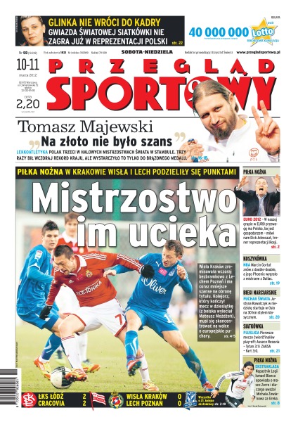 Kulomiot Tomasz Majewski został brązowym medalistą halowych mistrzostw świata; Łukasz Kubot pokonał w pierwszej rundzie turnieju w Indian Wells Ivo Karlovacicia; Wisła Kraków zremisowała bezbramkowo z Lechem Poznań; Justyna Kowalczyk w niedzielę startuje w Oslo na 30 km stylem klasycznym.