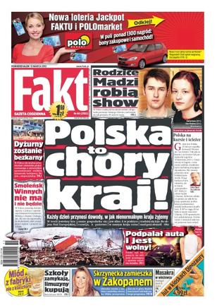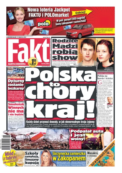 Polska to chory kraj – każdy dzień przynosi dowody w jak nienormalnym kraju żyjemy; rodzice Madzi robią show; dyżurny pozostanie bezkarny; Smoleńsk – winnych nie ma i nie będzie; podpalał auta i jest wolny – polski sąd wypuszcza na wolność przestępcę i ujawnia nazwisko świadka; miód z fabryki nie z klasztoru; szkoły zamykają, limuzyny kupują – bezczelność MEN; Kasia Skrzynecka zamieszka w Zakopanem; masakra w wieżowcu – zadźgał dwóch ludzi.