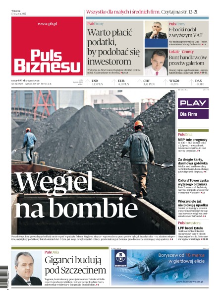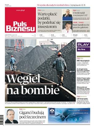 Węgiel na bombie – ponad 10 tysięcy firm prowadzących składy może wpaść w pułapkę fiskusa – zdaniem ekspertów, węglowa akcyza to największy podatkowy bubel ostatnich lat; warto płacić podatki, by podobać się inwestorom – w drodze na NewConnect lepiej nie obniżać rentowności; e-booki nadal z wyższym VAT; bunt handlowców przeciw galeriom; NBP tnie prognozy – zdaniem ekspertów bank wykazuje nadmierny pesymizm; za drogie karty, darmowa gotówka – wielkie sieci handlowe chcą cięć interchange, bo za obsługę gotówki prawie nie płacą; Oxford Tower zyska wyższego bliźniaka – Twin Towers, tak będzie się nazywał kompleks wieżowców w centrum Warszawy; LPP broni tytułu Giełdowej Spółki Roku; giganci budują pod szczecinem – Tognum zainwestuje w fabrykę w Stargardzie Szczecińskim.