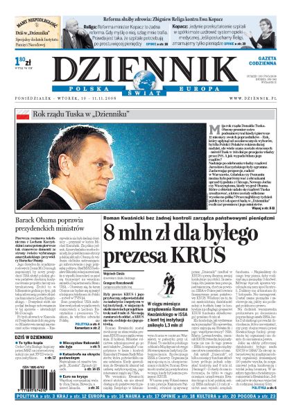 Podsumowanie dwunastu miesięcy rządów Donalda Tuska; Piotr Kownacki nieprawdziwie zrelacjonował rozmowę Baracka Obamy z Lechem Kaczyńskim w sprawie tarczy antyrakietowej; kupiony przez MSZ na aukcji Order Orła Białego nie jest XVIII-wiecznym zabytkiem; z sondażu CBOS wynika, że dla Polaków najważniejsze są symbole, a nie uczciwe życie i praca dla dobra wszystkich; największa tragedia rosyjskiego okrętu podwodnego od czasów „Kurska”; przyśpiesza integracja walutowa Europy - Dania, Szwecja i Islandia chcą wprowadzić u siebie euro; najnowsze zdjęcia kosmosu.