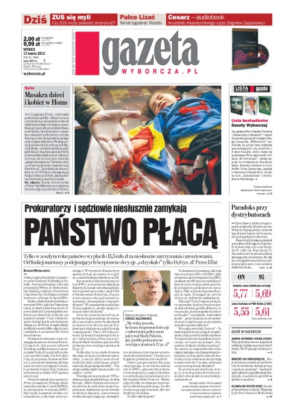 Prokuratorzy i sędziowie niesłusznie zamykają, państwo płacą - tylko w zeszłym roku państwo wypłaciło 13,5 miliona złotych za niesłuszne zatrzymania i aresztowania - od funkcjonariuszy podejmujących bezprawne decyzje "odzyskało" tylko 14,4 tysiąca złotych przez 13 lat; masakra dzieci i kobiet w Homs - co najmniej 47 ciał odkryto w nocy z niedzieli na poniedziałek w dwóch dzielnicach miasta od miesięcy ostrzeliwanego przez siły prezydenta Baszara al-Asada; ZUS się myli - czy ZUS może zawiesić emeryturę; paradoks przy dystrybutorach - sprzedawcy paliw przygotowali łamigłówkę dla kierowców - w hurcie olej napędowy od dwóch tygodni jest tańszy niż benzyna, ale na stacjach jest odwrotnie; Armia wymieni stare Stary - MON planuje wielki przetarg; śmierć na mrugnięcie - całkowicie sparaliżowany Brytyjczyk poprosił sąd o zgodę na eutanazję.