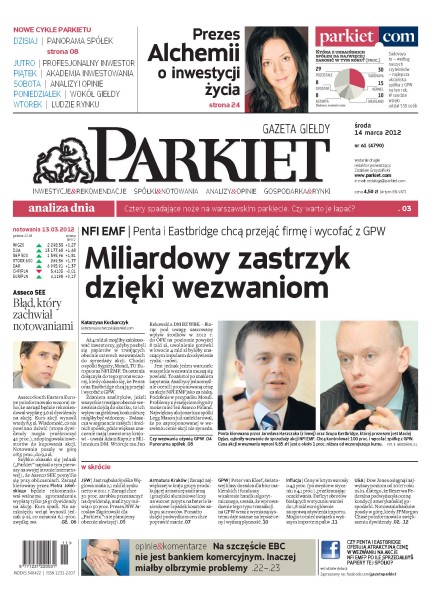 Penta wezwała do sprzedaży akcji NFI EMF – gdyby wszystkie trwające obecnie wezwania się powiodły, do inwestorów trafiłoby prawie 4 mld zł gotówki; Jastrzębska Spółka Węglowa w 2011 r. miała 2,1 mld zł zysku netto – w tym roku chce zwiększyć produkcję i sprzedaż; błąd pisarski podbił kurs Asseco SEE; Armatura Kraków zapowiada wzrost sprzedaży i rentowności; na rekordowe przychody GPW i jeden z wyższych rocznych zysków netto cieniem rzucają się słabsze rezultaty w czwartym kwartale; inflacja w lutym wyniosła 4,3 proc. – na tę wiadomość złoty osłabił się o 3 grosze; nie zanosi się na dodruk pieniądza w USA.