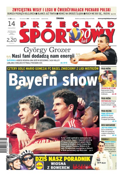 Bayern show – cztery gole Gomeza – FC Basel zmieciony z Ligi Mistrzów; zwycięstwa Wisły i Legii w ćwierćfinałach Pucharu Polski; „Nasi fani dodadzą nam energii” – Gyorgy Grozer o meczu między Asseco Resovia a ACH Volley Lublana o miejsce w finale pucharu CEV; Przemysław Tytoń wrócił do bramki PSV Eindhoven; Polonia Warszawa w rozsypce przed piątkowymi derbami z Legią; PGNiG Superliga mężczyzn – sezon zasadniczy pod lupą Przeglądu Sportowego; Justyna Kowalczyk chce dziś w Sztokholmie powalczyć o awans w klasyfikacji sprintu; Robert Kubica wraca za kółko – ostatnio testował rajdową Fabię i jeździł gokartami.