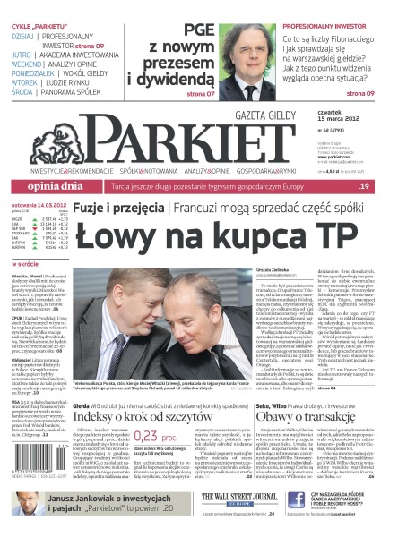 Łowy na kupca TP – Francuzi mogą sprzedać część spółki; indeksy o krok od szczytów – WIG odrobił już niemal całość strat z niedawnej korekty spadkowej; obawy o transakcję – akcjonariusz Wilbo, Clarisa Investments, ma wątpliwości w kwestii warunków przejęcia spółki przez Seko; PGE z nowym prezesem i dywidendą; co to są liczby Fibonacciego i jak sprawdzają się na warszawskiej giełdzie; producenci słodyczy, Mieszko i Wawel, obalili mit, że drożejące surowce psują całej branży wyniki; Zakład Produkcji Urządzeń Elektrycznych w tym roku wypłaci pierwszą w historii dywidendę; Litwa rozważa emisje papierów dłużnych w Polsce; 15 z 19 dużych amerykańskich instytucji finansowych pozytywnie przeszło nowe, bardzo surowe testy wytrzmałościowe przeprowadzone przez FED; Janusz Jankowiak o inwestycjach i pasjach.