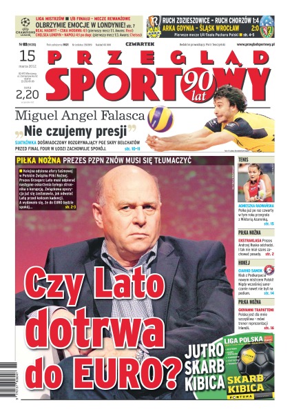 Czy Grzegorz Lato dotrwa do Euro – prezes PZPN znów musi się tłumaczyć; „Nie czujemy presji” – Miguel Angel Falasca, doświadczony rozgrywający PGE Skry Bełchatów, o Final Four w Łodzi; Ruch Zdzieszowice przegrał z Ruchem Chorzów 1-4; Arka Gdynia pokonała Śląsk Wrocław 2-0; Agnieszka Radwańska po raz czwarty w tym roku przegrała z Wiktorią Azarenką; prezes Ekstraklasy, Andrzej Rusko, odchodzi – nie miał szans zatrzymać posady; Ciarko Sanok nowym mistrzem Polski w hokeju – nigdy wcześniej drużyna z Podkarpacia nie była nawet na podium; Giovanni Trapattoni, trener reprezentacji Irlandii, twierdzi, że Polska jest dla niego szczęśliwa.
