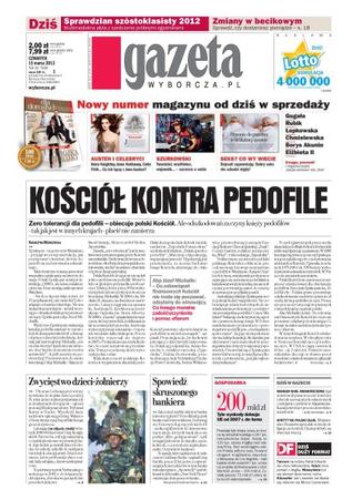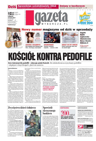„Zero tolerancji dla pedofilii” – obiecuje polski Kościół – ale odszkodowań za czyny księży pedofilów, tak jak jest w innych krajach, płacić nie zamierza; zmiany w becikowym – sprawdź, czy dostaniesz pieniądze; zwycięstwo dzieci-żołnierzy – Thomas Lubanga jest winny wcielania do wojska dzieci poniżej 15 roku życia i wykorzystywania ich w działaniach zbrojnych – ogłosił wczoraj Międzynarodowy Trybunał Karny w Hadze; spowiedź skruszonego bankiera – jak zostać szybko kimś w banku inwestycyjnym; dotacje UE od 2007 roku do teraz wyniosły 200 miliardów złotych; Nangar Khel nieskończone – sąd uniewinnił prawomocnie dowódcę i dwóch szeregowych oskarżonych o zabójstwo cywilów w Afganistanie; apetyt na polski dług – Ministerstwo Finansów sprzedało w środę obligację za 4 miliardy złotych – chętnych było na dwa razy więcej.