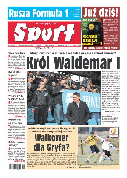 Król Waldemar I – który inny trener w Polsce ma takie poparcie wśród kibiców; rusza Formuła 1; prawdopodobny walkower dla Gryfa – działacze Legii Warszawa źle wypełnili protokół meczowy w Wejherowie; Centrozap zaproponował miastu sprzedaż swoich udziałów w GKS Katowice, jak na razie magistrat nie jest zainteresowany przejęciem władzy w klubie; Maciej Rybus zdecydował się na przenosiny do Tereka Grozny na krótko przed finałami Euro 2012; Władysław K., były kierownik drużyny i menedżer Groclinu Grodzisk Wlkp., został w czwartek zatrzymany przez funkcjonariuszy Centralnego Biura Antykorupcyjnego; Orest Lenczyk musiał się wczoraj tłumaczyć przed władzami miasta z gry Śląska Wrocław.