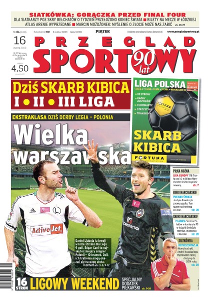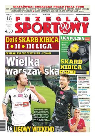 Wielka warszawska – dziś derby Legia kontra Polonia; gorączka przed Final Four – dla siatkarzy PGE Skra Bełchatów o tydzień przełożono koniec świata – „Myślenie o złocie może nas zabić” – Marcin Możdżonek; Manchester United wyeliminowany z Ligi Europy po przegranej 1-2 w Bilbao; Justyna Kowalczyk znowu upadła, tym razem na treningu w Falun; sześciu Polaków w konkursie PŚ w lotach – dwieście metrów Zniszczoła i Murańki; Andrea Anastasi podpisał nowy kontrakt – poprowadzi naszą drużynę do 2014 roku.