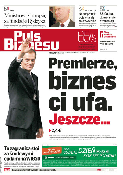 Przedsiębiorcy zrzeszeni w Business Centre Club oceniają pierwszy rok rządów koalicji; rząd prześwietli fundacje ojca Rydzyka - będzie prokuratorskie postępowanie wyjaśniające; pocztowcy będą dziś dyskutować nad planem naprawy; gospodarka Niemiec weszła w recesję; złoty odrobił część strat do dolara i euro; psychologia: konsekwencje miłości do pracy i pieniędzy mogą okazać się zgubne.