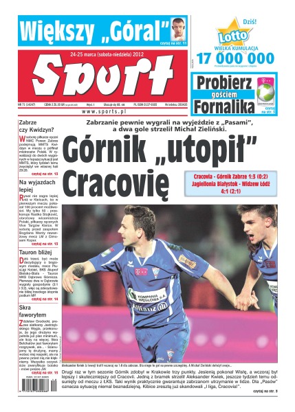 Zabrzanie pewnie wygrali na wyjeździe z „Pasami”, a dwa gole strzelił Michał Zieliński; Bułgar Krassimir Bałakow ma wyprowadzić FC Kaiserslautern z dna tabeli; dlaczego Jorgos Karagounis, kapitan reprezentacji Grecji, to mistrz prowokacji; Tomasz Adamek potwierdził, że jak pokona Nagy Aguilerę, to już w czerwcu stoczy kolejny pojedynek; Kate Middleton, małżonka drugiego w kolejce do brytyjskiego tronu księcia Williama, wzięła udział w treningu narodowej