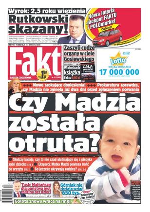 Jaka jest tajemnica śmierci Madzi; detektyw Rutkowski został skazany na 2,5 roku więzienia; wstrząsające ustalenia biegłych po ekshumacji Przemysława Gosiewskiego; Dorota Zielińska wygrała walkę o swoje życie – lekarze muszą jej podać lek, którego NFZ nie chciał refundować; Edyta Górniak nie chciała podpisać intratnego kontraktu z siecią komórkową; Katarzyna Figura świętowała 50-tkę z mężem; Adamek zamierza dziś pokonać Aguilerę, a za rok bić się o mistrzostwo świata; Jagiellonia rozbiła Widzew 4:1.