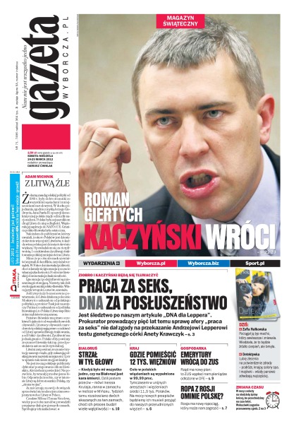 Czy złamano prawo ws. DNA dziecka Anety Krawczyk; Rosja rozpoczęła eksport ropy za pośrednictwem nowego ropociągu, który pozwala ominąć Polskę przez Morze Bałtyckie; Benedykt XVI rozpoczął podróż do Meksyku i na Kubę; nowy album Madonny „MDNA” przypomina wszystkim wątpiącym, kto jest królową show-biznesu; deputowany do parlamentu Ukrainy przeszedł z opozycji do obozu władzy, a potem ujawnił, że dostał za to pół miliona dolarów; dlaczego tylko Japończyk nie czuje się w Japonii obco; narciarstwo w upalnym Dubaju jest równie ważne jak wyścigi wielbłądów w alpejskiej Austrii; ponad pół roku po laniu od Witalija Kliczki Tomasz Adamek wraca na ring.