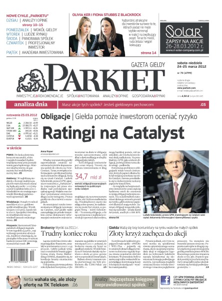 Giełda pomoże inwestorom oceniać ryzyko; 13 spółek, które mogą zrujnować portfel; dlaczego Catalyst potrzebuje lepszych zabezpieczeń; PGNiG ma do końca kwietnia ustalić z partnerami zasady współpracy przy szukaniu gazu; w 2011 r. giełdowe spółki zajmujące się obrotem wierzytelnościami zarobiły 172 mln zł.; amerykański Kongres zrobił kolejny krok w kierunku wprowadzenia prawa, które ułatwiając spółkom pozyskiwanie kapitału, może też ułatwić oszustwa finansowe; kilka faktów o polskiej konsumpcji; nieprawidłowości w sprawozdaniach finansowych pod okiem nadzoru; akcje koncernów górniczych lepsze niż surowce; wyniki finansowe domów maklerskich za 2011 r. wskazują, że branża wyraźnie odczuwa każdy przejaw marazmu na warszawskim parkiecie.