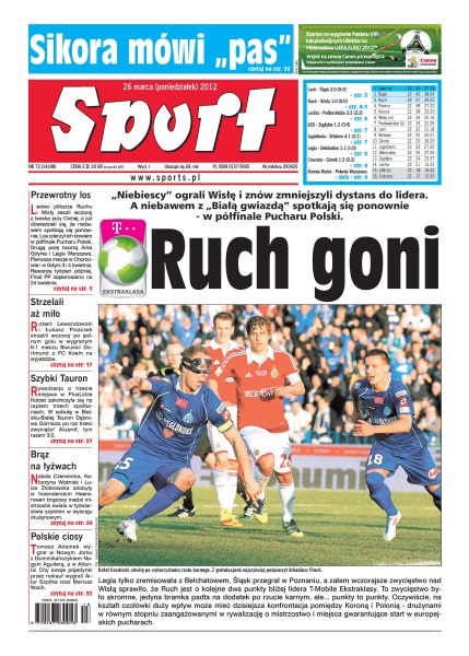 Ruch Chorzów i Wisła Kraków zagrają w półfinale Pucharu Polski; Natalia Czerwonka, Katarzyna Woźniak i Luiza Złotkowska zdobyły w Heernveen brązowy medal mistrzostw świata w łyżwiarstwie szybkim w wyścigu drużynowym; Tomasz Adamek wygrał w Nowym Jorku z Nagym Aguilerą.