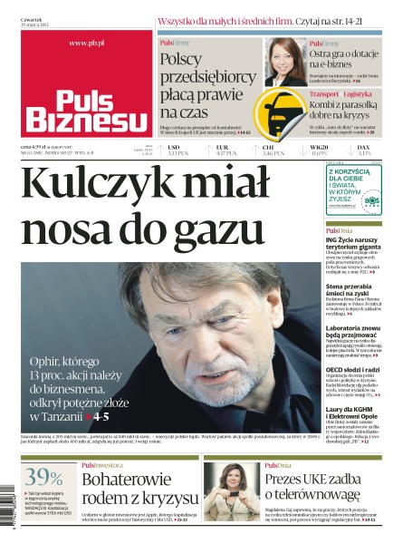 Ophir, którego 13% akcji należy do Jana Kulczyka, odkrył potężne złoże gazu w Tanzanii; ING Życie szykuje ofensywę na rynku grupowych polis pracowniczych, dotychczas wszyscy odważni rozbijali się o mur PZU; Stena, rodzinna firma Dana Olssona zainwestuje w Polsce 30 mln zł w budowę kolejnych zakładów recyklingu; KGHM i Elektrownia Opole zostały uznane przez samorządowców za filary województw: dolnośląskiego i opolskiego.