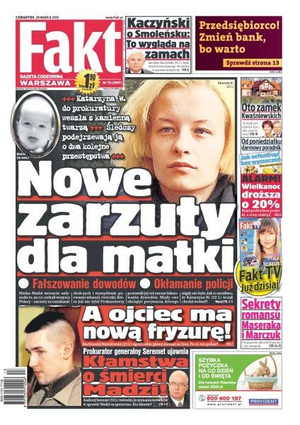Nowe zarzuty dla matki Magdy z Sosnowca; Jarosław Kaczyński żąda międzynarodowego śledztwa w sprawie katastrofy w Smoleńsku; rząd ma 300 limuzyn i 128 szoferów; Ilona Felicjańska musi sprzedać apartament.