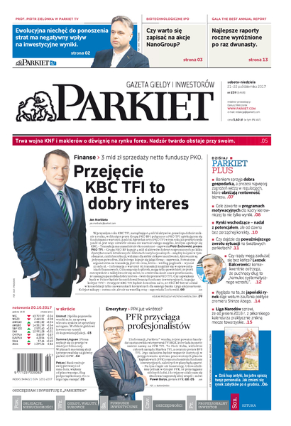 Największy w Polsce newsroom gospodarczy zbiera, analizuje i zgłębia dla Państwa najważniejsze informacje ze świata finansów. Codzienne wydanie „Parkietu”, sześć dni w tygodniu, to kilkadziesiąt artykułów o emitentach, instytucjach finansowych, gospodarce. To również opinie, felietony i wywiady z najważniejszymi ludźmi krajowej i globalnej finansjery.